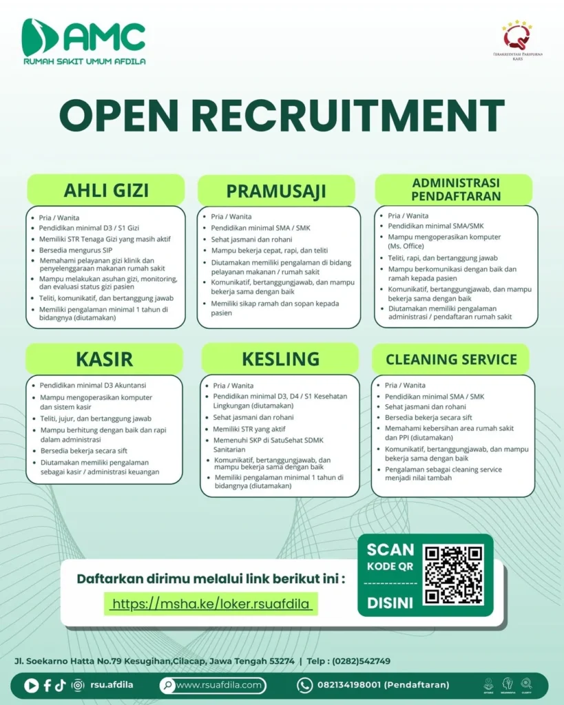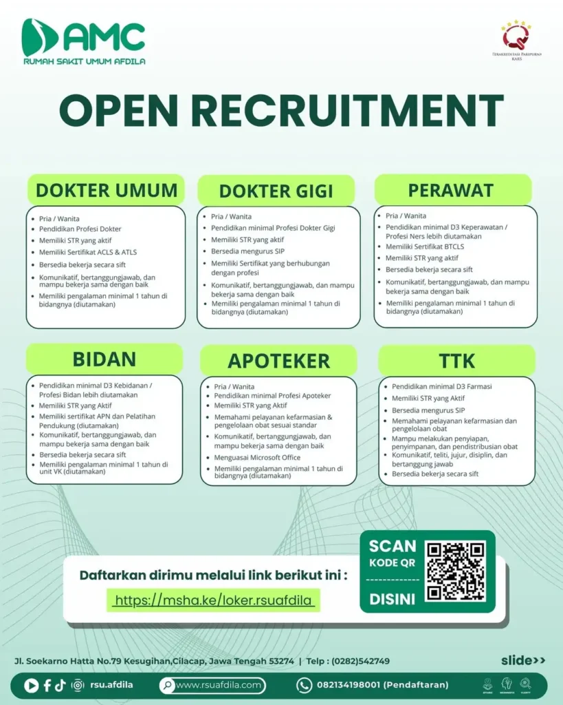 RSU Afdila Cilacap membuka kesempatan bergabung untuk berbagai posisi tenaga kesehatan & non-medis